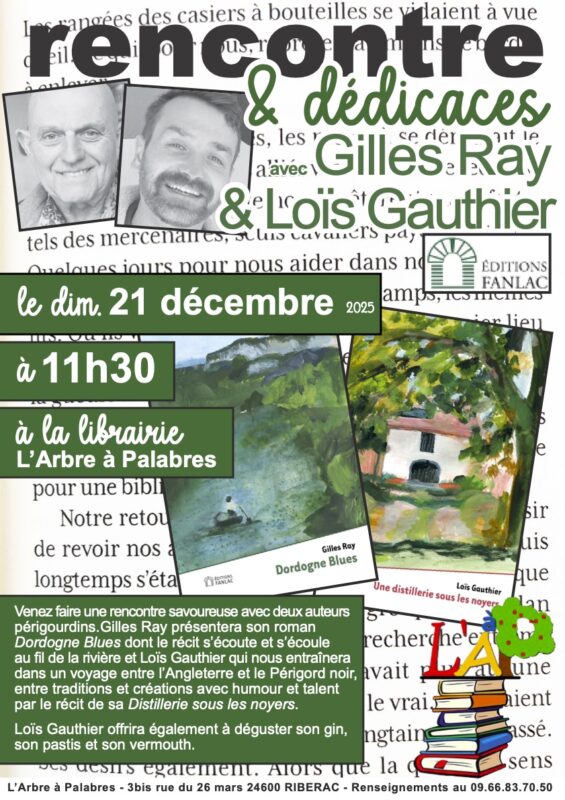 Le 21 décembre, à partir de 11h30, à la librairie L’Arbre à Palabres de Ribérac (24), venez rencontrer Gilles Ray, auteur de Dordogne Blues et Loïs Gauthier, auteur d’Une distillerie sous les noyers. La rencontre sera suivie d’une séance de dédicaces et de dégustation des spiritueux de la distillerie de l’Ort !